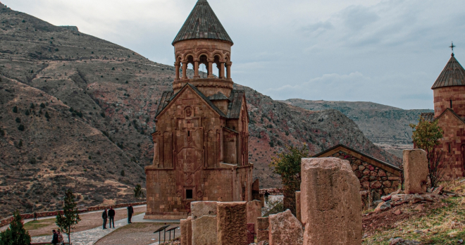 Po zajtrku odhod iz Jerevana proti jugu do samostana Khor Virap, ki leži ob vznožju biblijske gore Ararat. Ta zgodovinski samostan je ena najpomembnejših romarskih točk v Armeniji in ponuja osupljiv panoramski razgled na zasneženi Ararat. Postanek v vasi Areni, znani po starodavnih tradicijah pridelave vina. Obisk lokalne vinske kleti in pokušnja tradicionalnega armenskega vina. Nadaljevali bomo skozi slikovito sotesko Amaghu do samostana Noravank (13. stoletje), ki se čudovito dviga med rdečimi skalami. Samostan je znan po svojih zapletenih kamnitih rezbarijah in dih jemajočem okolju, zaradi česar je ena glavnih točk vsakega obiska Armenije. Povratek v hotel in nočitev.